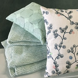 Eine Auswahl an Kissen und Decken, aber auch verschieden Wanddeko Artikel erwartet Sie in unserer Tapetenhalle.